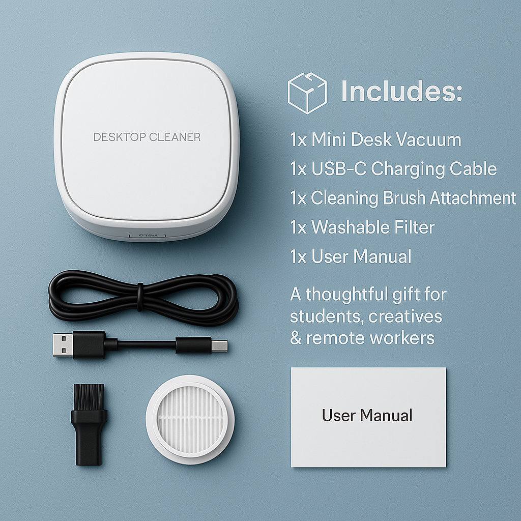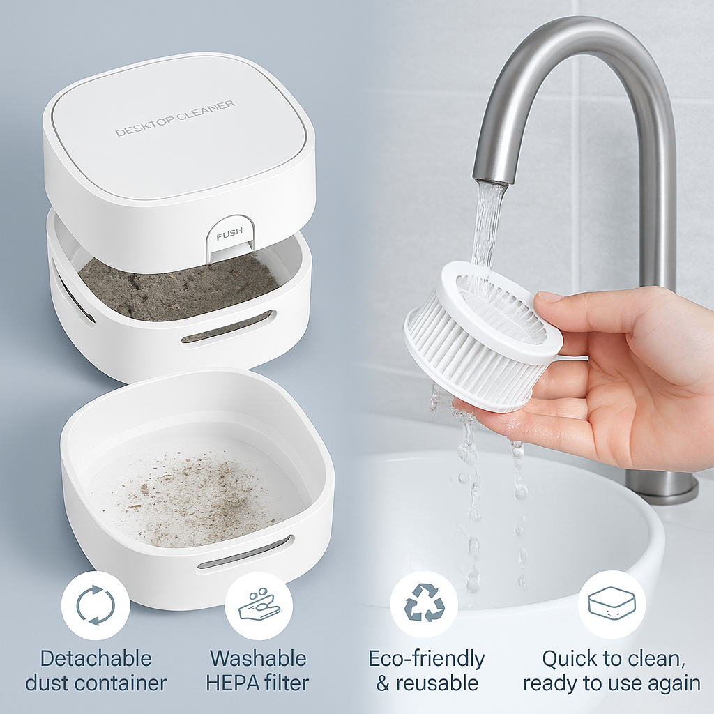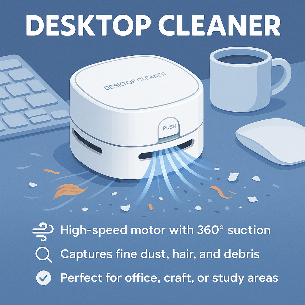Keep your workspace spotless with CleanSweep Mini, the ultimate portable cordless mini desk vacuum cleaner designed for fast and efficient cleaning. Lightweight and compact, this mini vacuum tackles crumbs, dust, and pet hair with powerful suction, making it perfect for your office desk, keyboard, or home workspace.