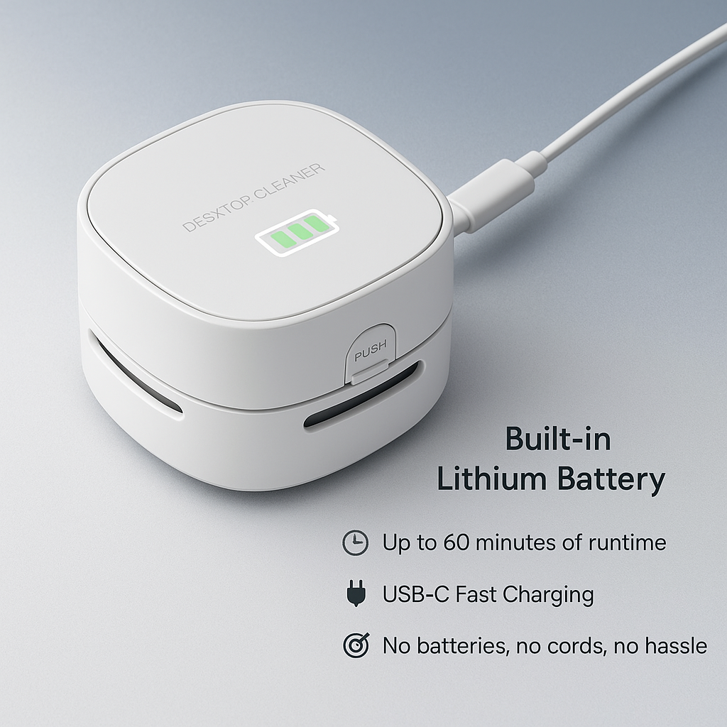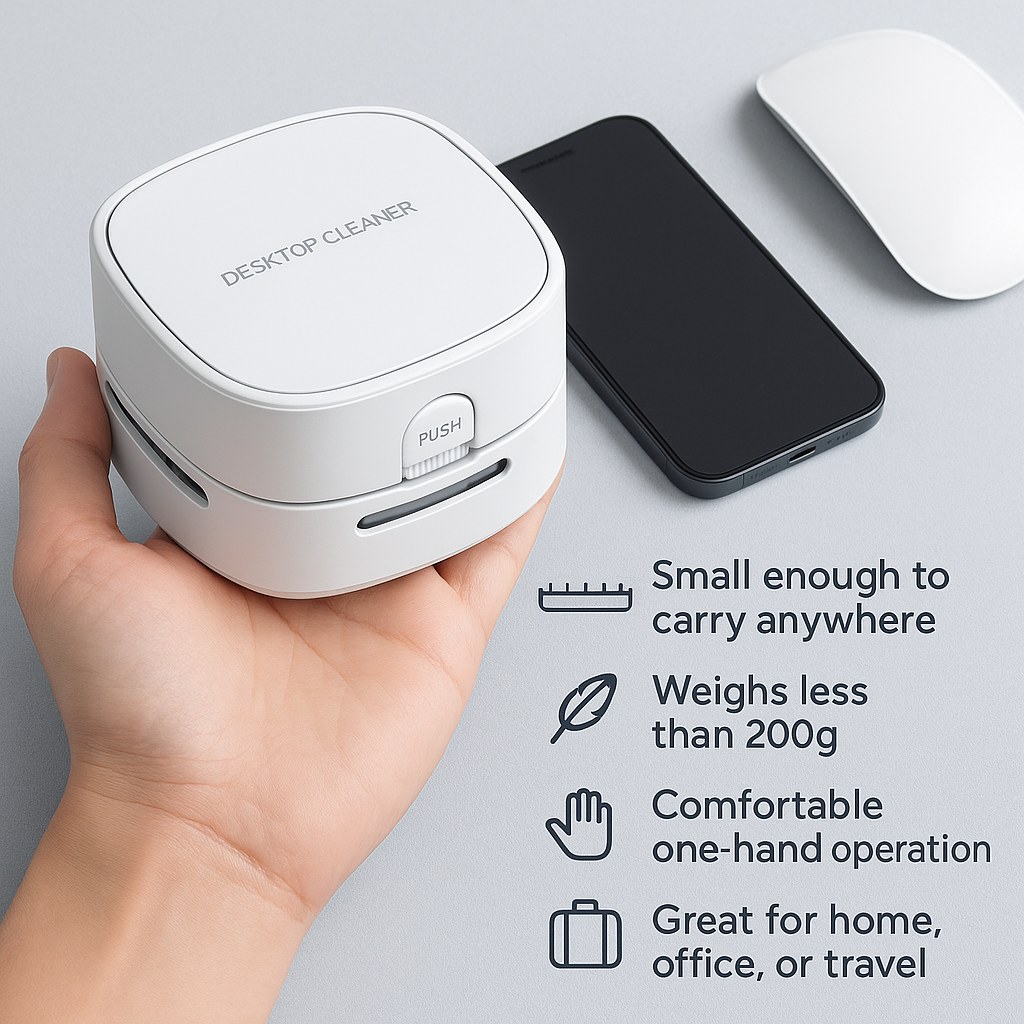 CleanSweep Mini is your go-to portable cordless mini desk vacuum cleaner for a neat, dust-free workspace—compact, powerful, and ready whenever you need it.