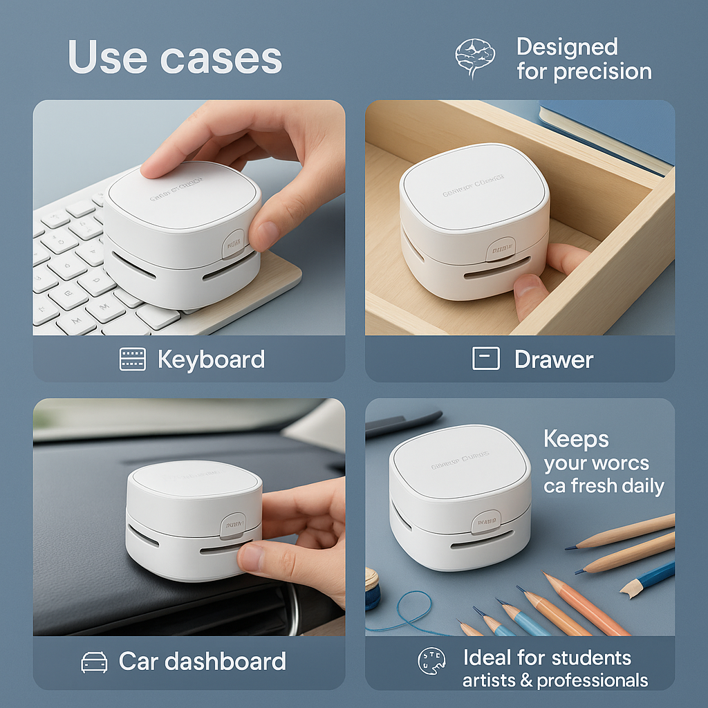 This mini vacuum cleaner is perfect for cleaning keyboards, computer desks, office tables, car interiors, and other small surfaces that easily collect dust.