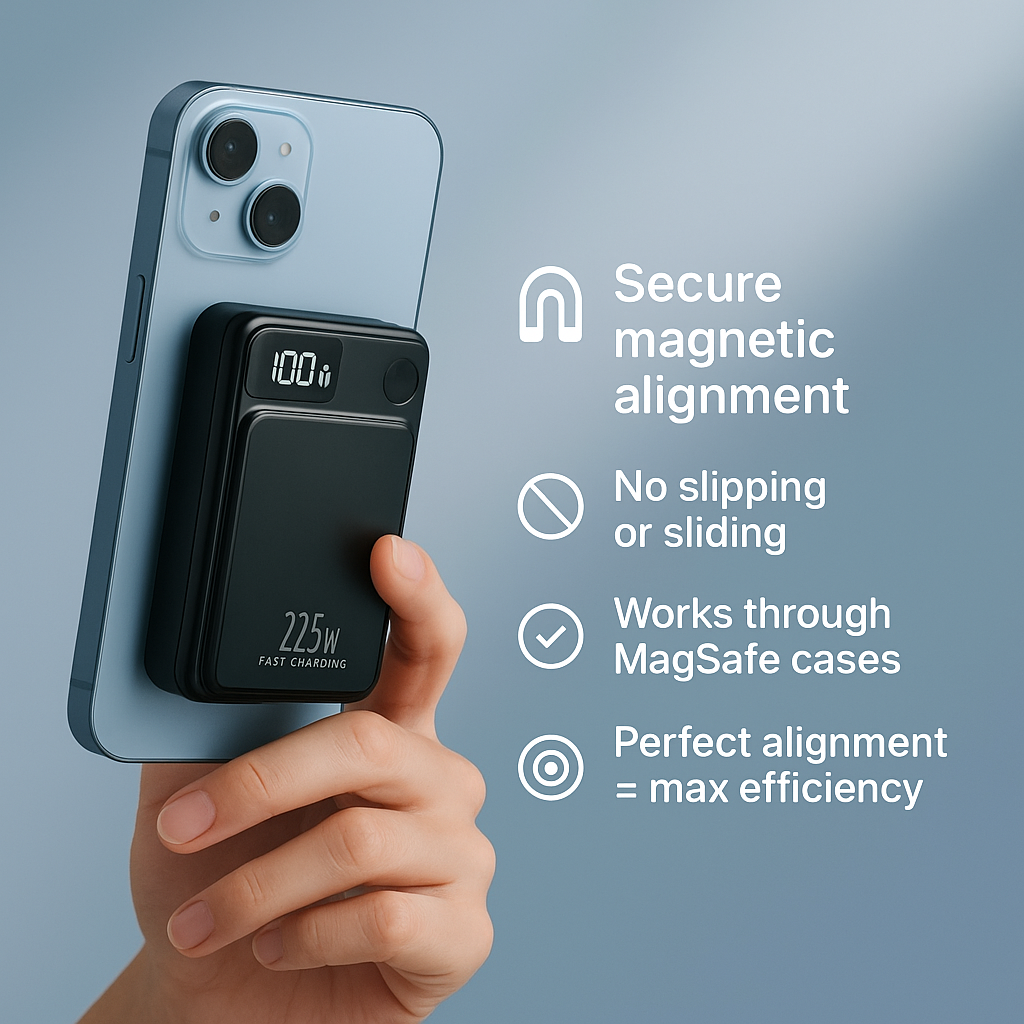 Fully Qi2-certified, this magnetic power bank for iPhone 12–16 series guarantees reliable performance, seamless compatibility, and optimized battery health for your device.