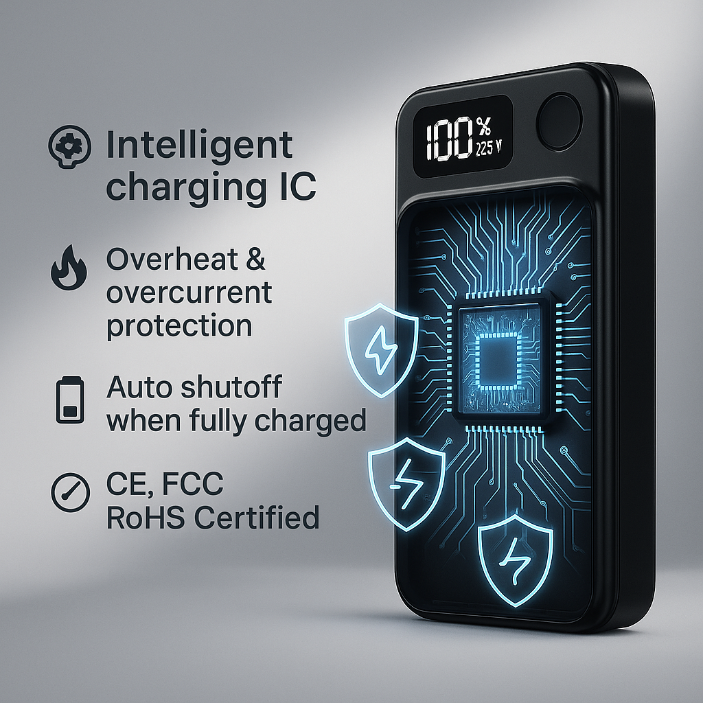 Yes, it features intelligent charging ICs, auto shutoff when fully charged, and overheat/overcurrent protection. It's CE, FCC & RoHS certified for safe, worry-free use.