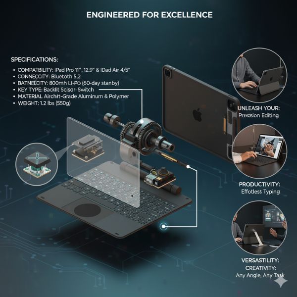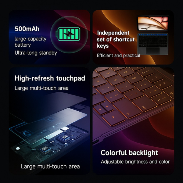 - Touchpad Functionality – Navigate your iPad Pro, iPad Air, or iPad Mini effortlessly with the built-in touchpad, offering laptop-like precision.