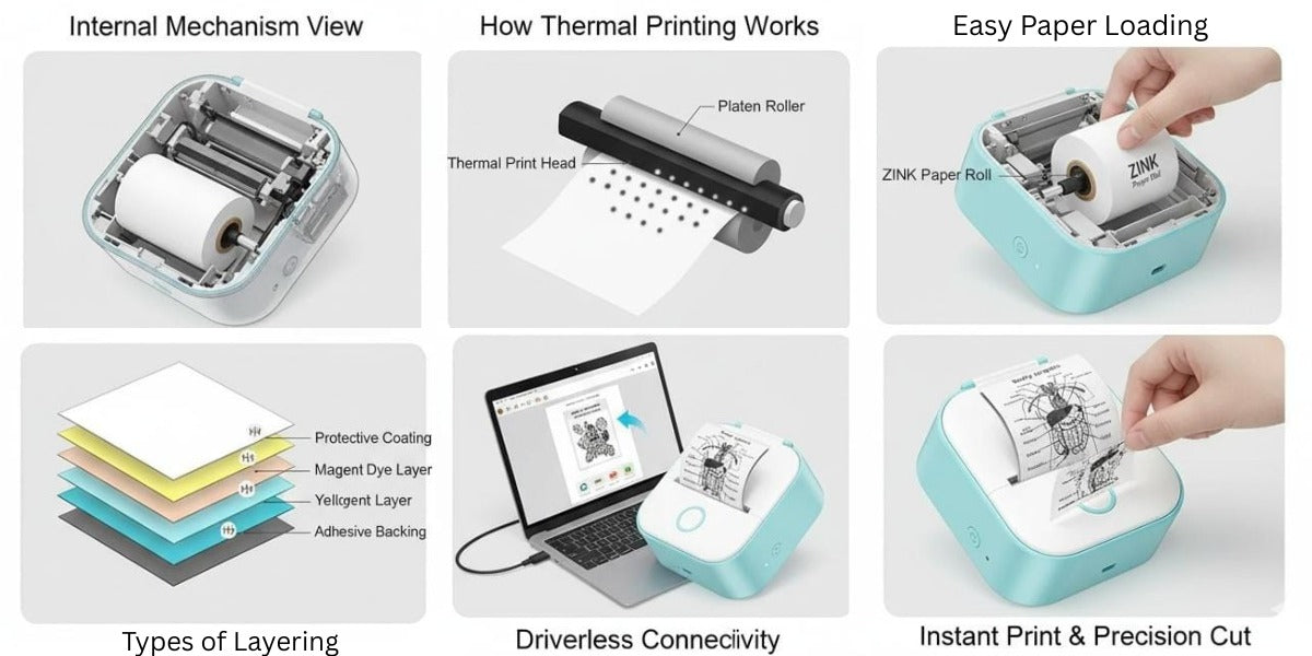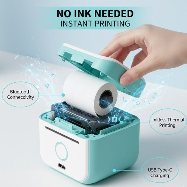 The mini portable printer works without ink by using thermal printing technology. It applies heat to special thermal paper, which is coated with chemicals that react to heat and produce images or text. This process eliminates the need for ink or toner, making it compact and convenient for everyday use.