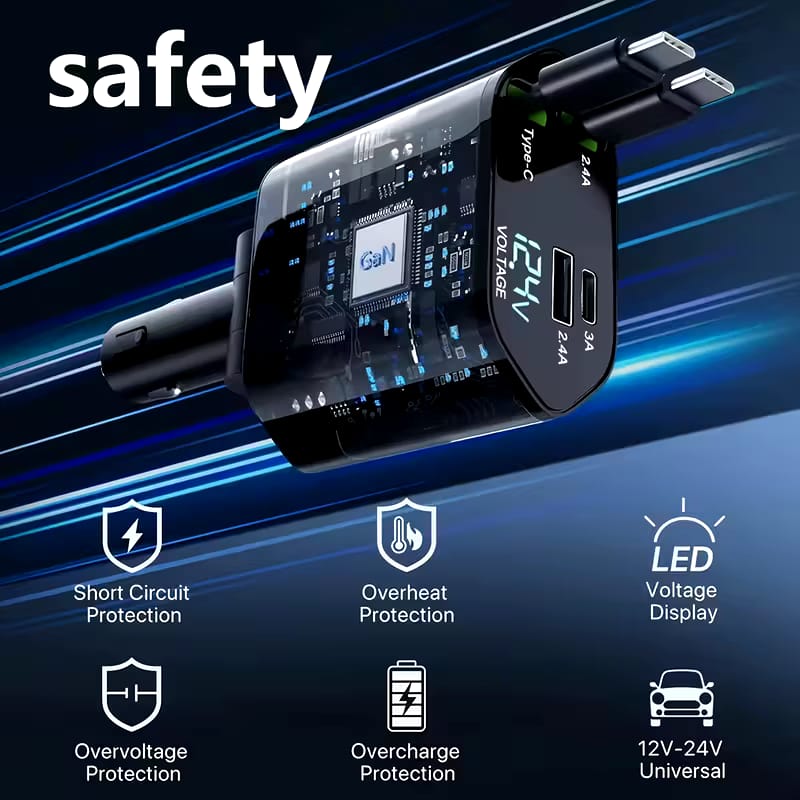 Designed for the modern driver, this universal retractable car charger features an LED voltage display for real-time monitoring, built-in overcharge protection, and a tangle-free retractable cable system that stores neatly and extends smoothly.